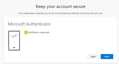 Once pointed at the QR code, your phone should scan it automatically and display ‘Account added successfully’. At this point you should see a Sumivector account in the list in your Microsoft Authenticator app. Back in your browser, click ‘Next’ and Microsoft will send a test authentication notification to your device through the app.