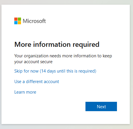 Microsoft will then prompt you to set up multiple-factor authentication (MFA) – hit next and follow the steps to set up the Microsoft Authenticator app.